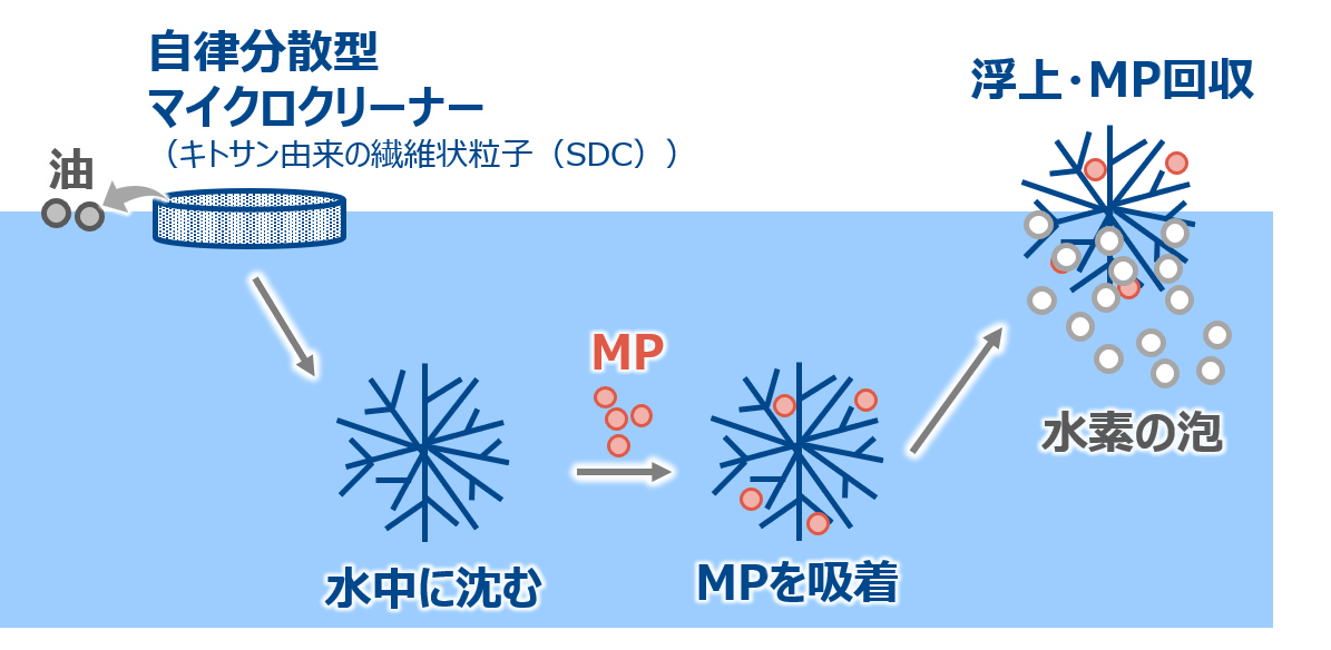この技術では、植物油を内包させたキトサン繊維状粒子(SDC)を水面に投入します。すると、SDCから染み出した油により、周囲の水との表面張力差が生じ、その差によって粒子が自ら動いて広範囲へと拡散します(マランゴニ効果)。拡散したSDCは、水中に沈降する過程で、ヤモリの足の接着原理に似た階層的な繊維構造によりMPを効率的に捕捉し、大きな塊を形成します(図2b)。