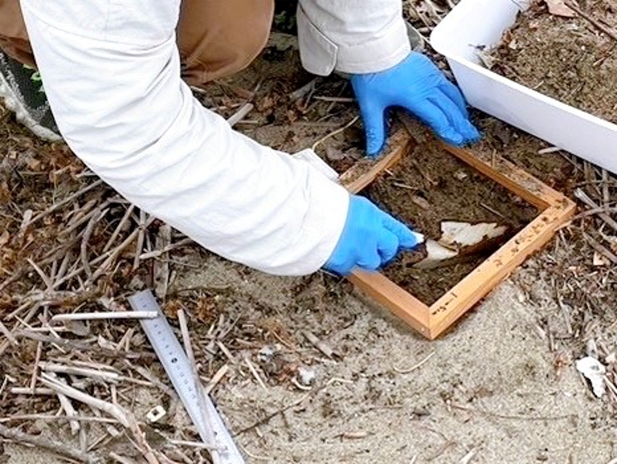 100円ショップなどで揃う道具でも、採取・記録の手順を標準化すれば、再現性のあるデータを集めることができます(図6a)。実際に、筆者が愛知県の汐川干潟(しおかわひがた)で行った調査では、1平方メートルあたり3万個(30,792個)を超えるMPが確認された地点もありました(図6b)。このような実態把握は、最新技術をどこに投入すべきかを判断するための「地図」になります。